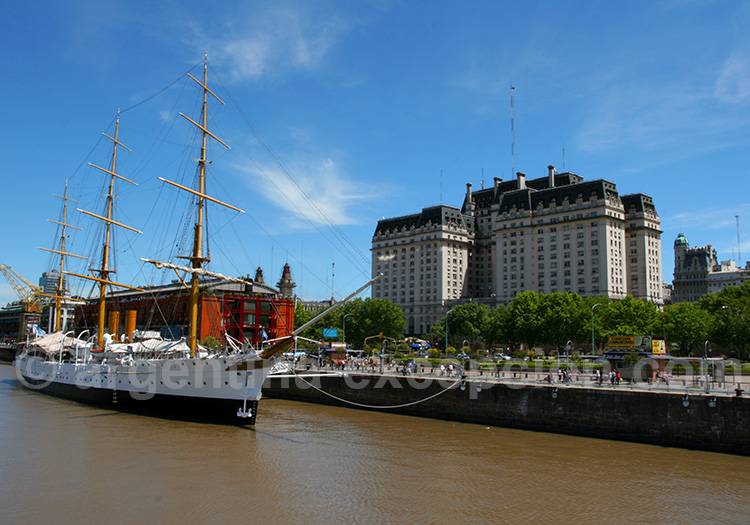 DESCRIPTIF : jusqu’au départ pour l’aéroport, la journée est consacrée à la découverte de Buenos Aires et/ou selon votre souhait, à du shopping. Les magasins de maroquinerie et d’objets gauchos, en particulier, offrent des produits assez originaux. Le tour de la ville passe par la avenida 9 de Julio, l’avenue la plus large du monde avec son obélisque de 65 m de haut, et l’avenue de Mayo dont l’influence galicienne se remarque à l’architecture des bâtiments. Sur la place de Mayo, on découvre la Casa Rosada, actuel palais du Gouvernement. On poursuit par le quartier de La Boca composé de petites maisons colorées construites avec les matériaux récupérés de bateaux, œuvres inspirées de poètes et peintres. Découverte de San Telmo, haut lieu d’antiquités et de bars à tango. La Recoleta est le quartier résidentiel dont les promenades sont agrémentées de ses nombreux parcs et places. Enfin Puerto Madero, ancien port entièrement rénové, est incontournable.