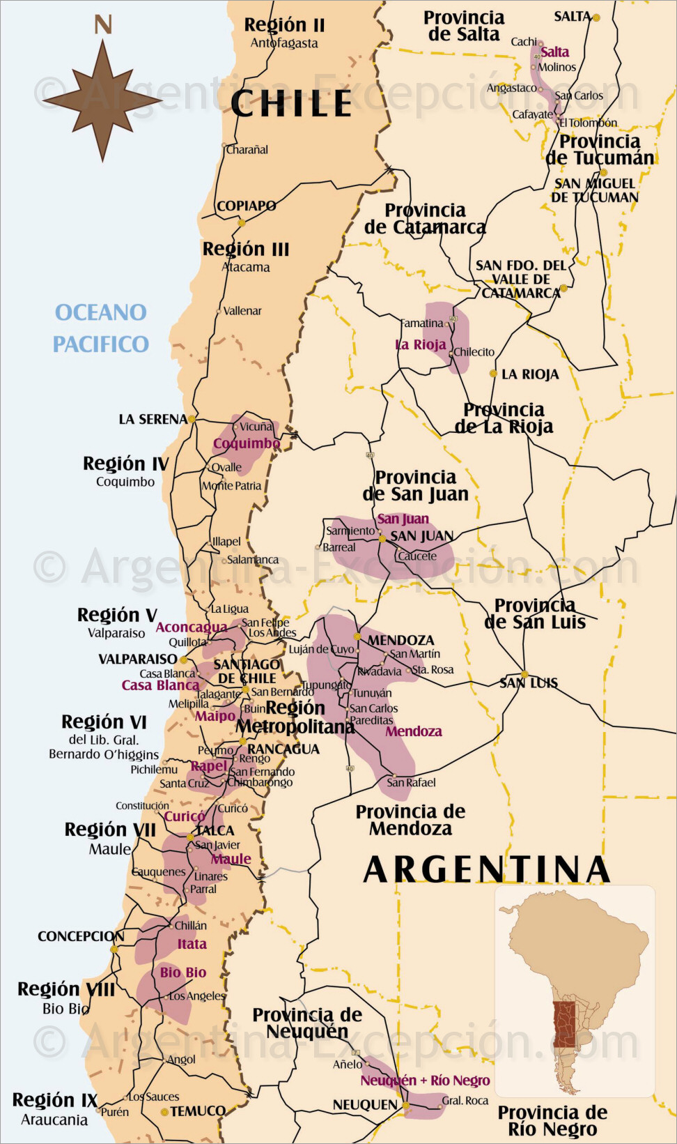 Carte de la route des vins en Argentine et au Chili