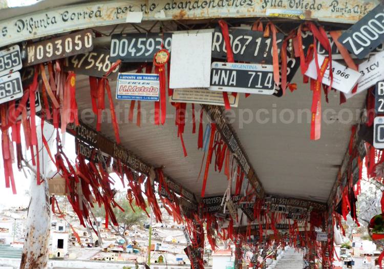 Tout dépend de la demande et de l’objet de la protection. Au fil des années, d’autres chapelles se sont ouvertes sur des thèmes précis : la chapelle du sport, celles de la police, de l’armée, de la mariée, des constructeurs… au total, une trentaine de chapelles existent à ce jour. Une petite ville a commencé ainsi à prendre forme en plein désert, puisque des restaurants et des vendeurs de souvenirs s’y sont installés. Mais, le lieu le plus visité reste le sommet de la colline où est morte la Difunta Correa, que l’on atteint par un escalier où sont placées des milliers de plaques d’immatriculation de voiture « protégées ». La statue la représentant mourante et allaitant son enfant reçoit la visite de milliers de pèlerins chaque année.