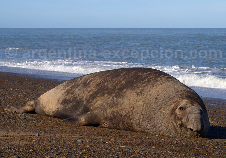 L’éléphant de mer est le plus imposant membre de la famille des phoques : les mâles ont un poids moyen de 2 tonnes (3 tonnes pour les plus gros) et une longueur de 4 mètres, les femelles sont trois à quatre fois plus petites. Il doit son nom aux narines du mâle, qui se développent en forme de trompe leur servant à rugir et à se battre pour défendre leur harem. Après une gestation de neuf mois, les femelles mettent bas à partir de septembre et allaitent environ trois semaines. Les petits naissent avec une fourrure noire, qui les protège jusqu’à la première mue. L’éléphant de mer passe en réalité la majeure partie de son temps dans l’eau, plongeant pour se nourrir de poissons et calmars, jusqu’à 1.000 m de profondeur. L’espèce, longtemps chassée, est toujours protégée mais plus menacée.