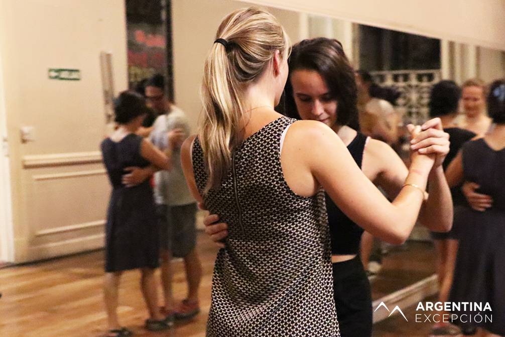 Derrière une façade aux teintes canari et acidulées, en haut d’un escalier escarpé sur les marches duquel les amateurs de danse attendent patiemment le début de leur cours, se trouve l’école de tango de Buenos Aires. Si cette dernière épouse, au premier abord, l’aspect d’un café au charme certain jouxtant une boutique d’articles de tango, nous découvrons néanmoins l’une de ses nombreuses salles, son grand miroir et son joli plancher, couronnés de hauts plafonds.