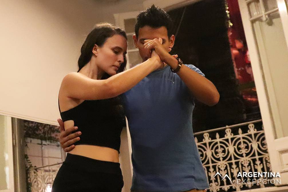 Nous y attend notre professeur pour les deux prochaines heures, Elise Barbot. Cette jeune française est partie vivre pleinement la passion qu’elle éprouve pour la danse, dont elle s’apprête à nous donner un aperçu. Après un bref échauffement, notre instructrice lance la musique qui dès lors occupe l’espace autant que notre petit groupe, que nous assemblons par paires afin de nous mettre respectivement dans les rôles masculin et féminin dont les pas diffèrent considérablement. En effet, le danseur jouit de la facilité de danser tout en ayant le regard tourné vers l’avant, contrairement à la danseuse qui, quant à elle, doit se mouvoir vers l’arrière en ayant une confiance – littéralement – aveugle en son partenaire. Ce dernier a donc pour rôle de mener le pas, en guidant sa partenaire dans cette danse d’improvisation dont nous commençons à saisir l’essence. Tout repose donc sur l’écoute, du rythme d’une part, et corporelle, pour ainsi dire, de son partenaire d’autre part. Nous nous essayons ainsi à quelques pas parfois maladroit sous l’œil avisé de notre professeur qui nous prodigue d’excellents conseils avec grande pédagogie.