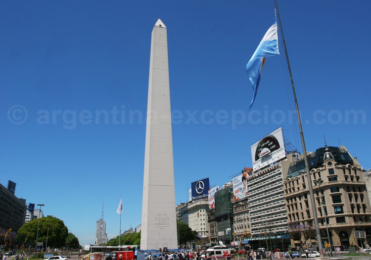 L’Obélisque de Buenos Aires fut réalisé en 1936 par Albert Prebisch, architecte moderniste argentin, à la demande de l’intendant de la ville pour les 400 ans de la Nation. Il mesure 67,5 m de hauteur, n’a qu’une seule porte d’entrée, dispose de quatre fenêtres à son sommet que l’on peut atteindre seulement par un escalier vertical de 206 marches. Il est par ailleurs situé au centre de la Plaza República, sur l’Avenida 9 de Julio, à l’intersection de l’Avenida Corrientes. En 1938, le nouvel intendant de la ville voulut faire détruire l’Obélisque pour des raisons économiques, esthétiques et de sécurité mais le pouvoir exécutif municipal mit son véto en expliquant que ce monument était sous protection de la Nation. Depuis, c’est l’une des icônes de la capitale. L’Obelisco est utilisé comme point de repère au cœur de la ville et sert comme place de rassemblement pour diverses manifestations. Le 26 juillet 1952 notamment, le peuple argentin s’est spontanément retrouvé au pied de l’Obélisque pour lamenter le décès d’Evita Perón.