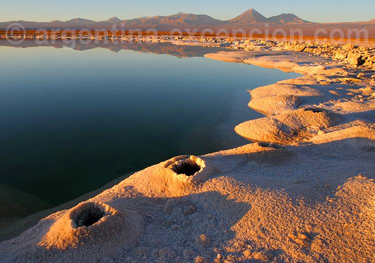 DESCRIPTIF : vous démarrez votre circuit à San Pedro de Atacama en direction de Toconao, beau point de vue sur l’ensemble du salar d’Atacama, oasis construit en tuf volcanique blanchâtre. À proximité on fera une petite marche dans la faille de Jerez, dont la végétation contraste avec l’aridité du désert. Vous redescendez au Salar où vous pouvez apercevoir 2 ou 3 sortes de flamands roses sur la lagune Chaxa. Après un déjeuner à San Pedro vous vous dirigez vers les lagunes de Cejar où vous pourrez nous baigner dans les eaux salées (40% de concentration de sel). Juste à côté, se trouve une 2ème lagune aux bordures en formation de sel dur, lieu paradisiaque en attendant la lumière du coucher de soleil sur les volcans Licancabur et Lascar.
